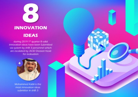 8 INNOVATION IDEAS during 2019 1st quarter 8 valid innovation ideas have been Submitted via system by shift 3 personnel which are escalated by JSOD Division head for evaluation 4 Mohammed Kabli is the most innovation ideas submitter in shift 3