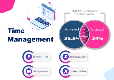 shift 3 2019 first quarter Vacation Balance Time Achieved Targeted Management 26.5% 24% p 88 hours P-Time Z Zero hours Z-Time M 49 days M-Time X Zero hours X-Time