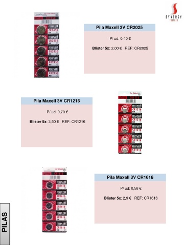 Pila Maxell 3V CR2025 P/ ud: 0,40 € Blister 5x: 2,00 € REF: CR2025 Pila Maxell 3V CR1216 P/ ud: 0,70 € Blister 5x: 3,50 € REF: CR1216 Pila Maxell 3V CR1616 P/ ud: 0,58 € Blister 5x: 2,9 € REF: CR1616 PILAS