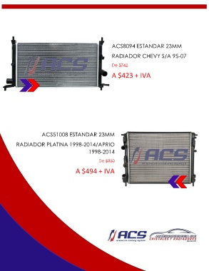ACS8094 ESTANDAR 23MM RADIADOR CHEVY S/A 95-07 De $742 A $423 + IVA ACS51008 ESTANDAR 23MM RADIADOR PLATINA 1998-2014/APRIO 1998-2014 De $950 A $494 + IVA