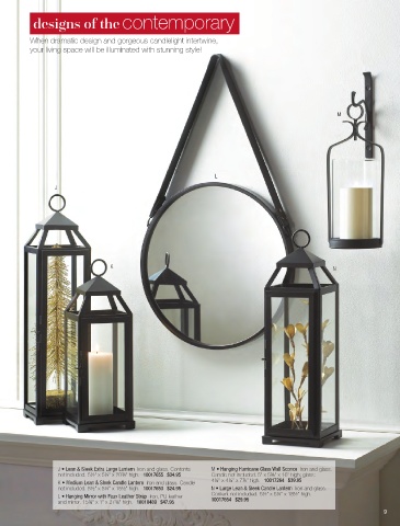 J • Lean & Sleek Extra Large Lantern Iron and glass. Contents M • Hanging Hurricane Glass Wall Sconce Iron and glass.