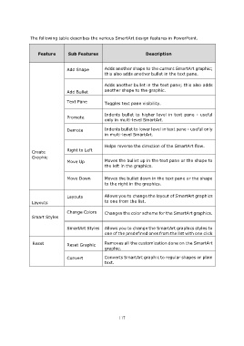 The following table describes the various SmartArt design features in PowerPoint.