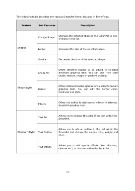 The following table describes the various SmartArt format features in PowerPoint.