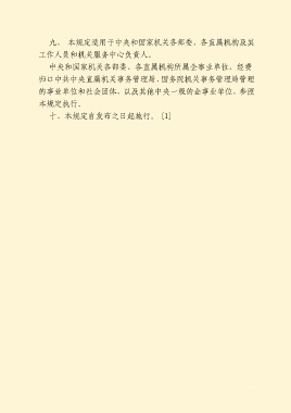 九、 本规定适用于中央和国家机关各部委、各直属机构及其 工作人员和机关服务中心负责人。 中央和国家机关各部委、各直属机构所属企事业单位,经费 归口中共中央直属机关事务管理局、国务院机关事务管理局管理 的事业单位和社会团体,以及其他中央一级的企事业单位,参照 本规定执行。 十、本规定自发布之日起施行。 [1] 218