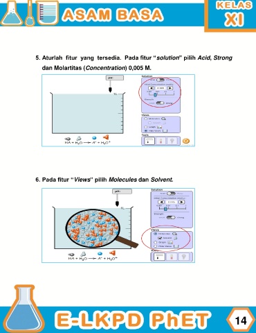 5. Aturlah fitur yang tersedia. Pada fitur “solution” pilih Acid, Strong dan Molartitas (Concentration) 0,005 M. 6. Pada fitur “Views” pilih Molecules dan Solvent. 14