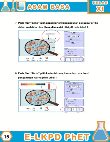 7. Pada fitur “Tools” pilih pengukur pH lalu masukan pengukur pH ke dalam wadah larutan. Kemudian catat nilai pH pada tabel 1. 8. Pada fitur “Tools” pilih kertas lakmus, kemudian catat hasil pengamatan warna pada tabel 1. 15