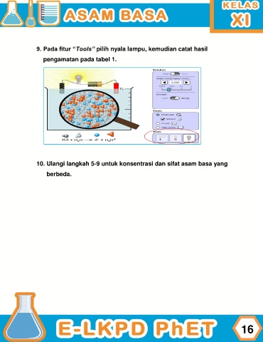 9. Pada fitur “Tools” pilih nyala lampu, kemudian catat hasil pengamatan pada tabel 1. 10. Ulangi langkah 5-9 untuk konsentrasi dan sifat asam basa yang berbeda. 16