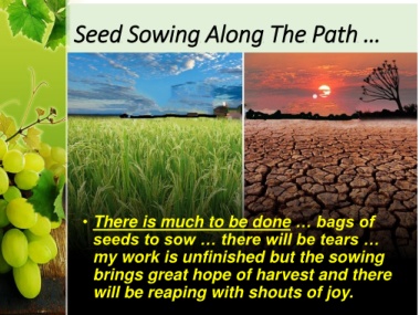 Seed Sowing Along The Path … • There is much to be done … bags of seeds to sow … there will be tears … my work is unfinished but the sowing brings great hope of harvest and there will be reaping with shouts of joy. 5