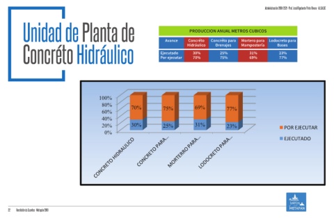 Concréto Hidráulico 70% Ejecutado 75% 30% Drenajes Mampostería Bases
