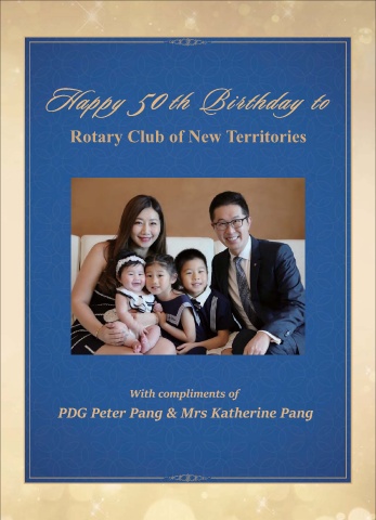 Happy 50th Birthday to Rotary Club of New Territories With compliments of PDG Peter Pang & Mrs Katherine Pang