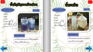 40 41 -น ้าเปล่า -อัญชัน -น ้ามะพร้าว -ตะไคร้ น ้าหอม -น ้าตาลทราย -น ้าเปล่า -มะพร้าวอ่อนขูด -น ้าใบเตย -น ้ามะนาว -เนื้อมะพร้าวอ่อน ตะไคร้ ช่วยรักษาอาการไข้(ใบสด)ช่วย น ้าใบเตยช่วยบ ารุงสมอง ประสาท เป็นยาแก้ไข้เหนือ(ราก) และแก้อาการอ่อนเพลีย