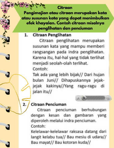 Citraan Pengimajian atau citraan merupakan kata atau susunan kata yang dapat menimbulkan efek khayalan. Contoh citraan misalnya penglihatan dan penciuman