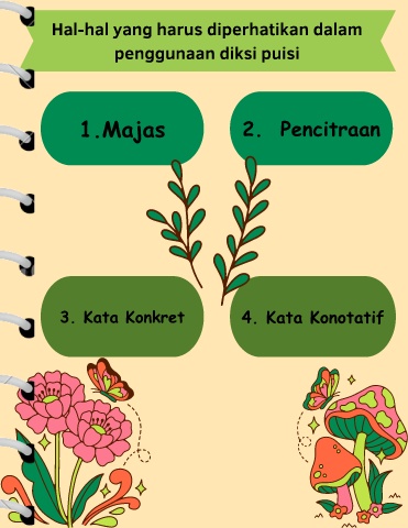 Hal-hal yang harus diperhatikan dalam penggunaan diksi puisi 1.Majas 2. Pencitraan 3. Kata Konkret 4. Kata Konotatif