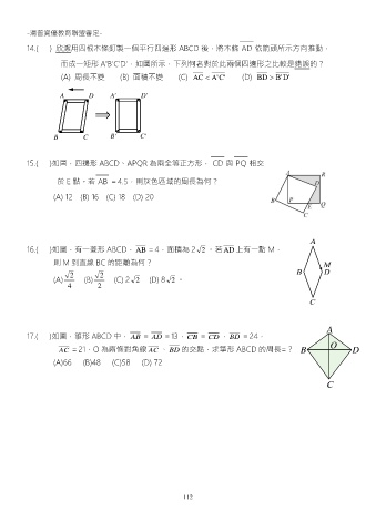 14.( ) 欣潔用四根木條釘製一個平行四邊形 ABCD 後,將木條 AD 依箭頭所示方向推動,