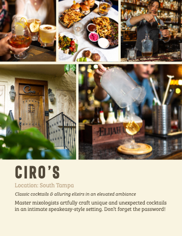 ciro’s Location: South Tampa Classic cocktails & alluring elixirs in an elevated ambiance Master mixologists artfully craft unique and unexpected cocktails in an intimate speakeasy-style setting. Don’t forget the password!
