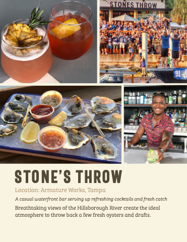 Stone’s throw Location: Armature Works, Tampa A casual waterfront bar serving up refreshing cocktails and fresh catch Breathtaking views of the Hillsborough River create the ideal atmosphere to throw back a few fresh oysters and drafts.