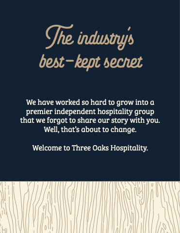 The industry’s best-kept secret We have worked so hard to grow into a premier independent hospitality group that we forgot to share our story with you. Well, that’s about to change. Welcome to Three Oaks Hospitality.
