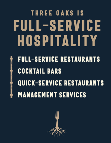 Three Oaks IS FULL-SERVICE HOSPITALITY FULL-SERVICE RESTAURANTS COCKTAIL BARS OUICK-SERVICE RESTAURANTS MANAGEMENT SERVICES