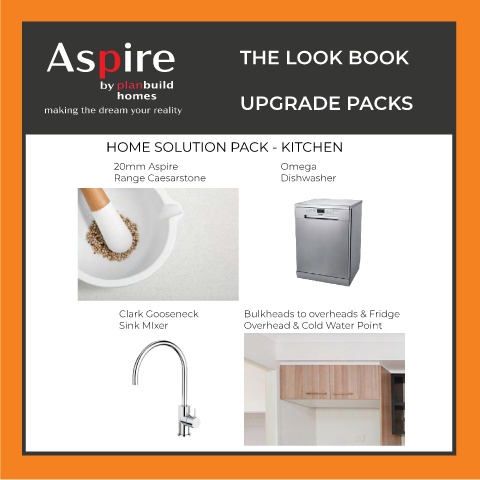 THE LOOK BOOK by UPGRADE PACKS making the dream your reality HOME SOLUTION PACK - KITCHEN 20mm Aspire Omega Range Caesarstone Dishwasher Clark Gooseneck Bulkheads to overheads & Fridge Sink MIxer Overhead & Cold Water Point