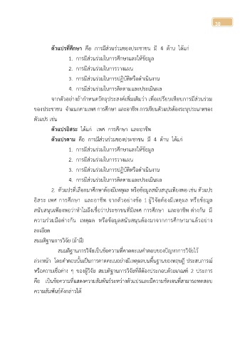 ตัวแปรที่ศึกษำ  คือ  การมีส่วนร่วมของประชาชน  มี  4  ด้าน  ได้แก่