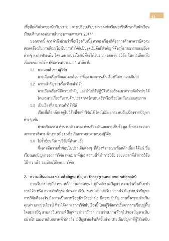 นอกจากนี้ ควรค านึงด้วยว่าชื่อเรื่องกับเนื้อหาของเรื่องที่ต้องการศึกษาควรมีความ