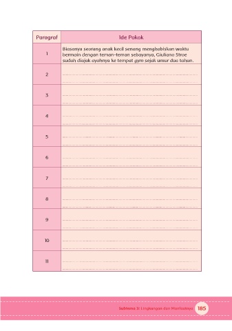 Paragraf Ide Pokok Biasanya seorang anak kecil senang menghabiskan waktu 1 bermain dengan teman-teman sebayanya, Giuliano Stroe sudah diajak ayahnya ke tempat gym sejak umur dua tahun. 2 3 4 5 6 7 8 9 10 11 Subtema 3: Lingkungan dan Manfaatnya 185