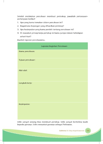 Udin sangat senang bisa membuat periskop. Udin sangat berterima kasih