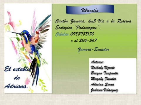 Ubicación Cantón Zamora, km5 Vía a la Reserva Ecologica “Podocarpus”. Celular.0988988170 o al 234-567 Zamora-Ecuador Autores: Nathaly Vizuete Brayan Tuapanta Magaly Fuentes Adreina Serna Jadrina Velasquez