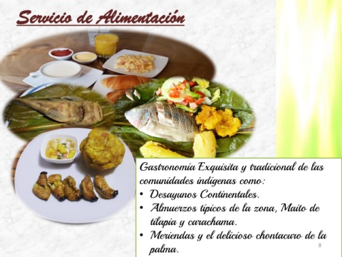 Servicio de Alimentación Gastronomía Exquisita y tradicional de las comunidades indígenas como: • Desayunos Continentales. • Almuerzos típicos de la zona, Maito de tilapia y carachama. • Meriendas y el delicioso chontacuro de la palma. 8