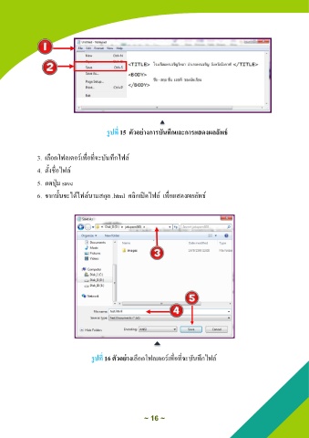 รูปที่ 15 ตัวอย่างการบันทึกและการแสดงผลลัพธ์ 3. เลือกโฟลเดอร์เพื่อที่จะบันทึกไฟล์ 4. ตั้งชื่อไฟล์ 5. กดปุ่ม save 6. จากนั้นจะได้ไฟล์นามสกุล .html คลิกเปิดไฟล์ เพื่อแสดงผลลัพธ์ รูปที่ 16 ตัวอย่างเลือกโฟลเดอร์เพื่อที่จะบันทึกไฟล์ ~ 16 ~