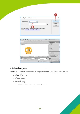 การจัดต าแหน่งของรูปภาพ รูปภาพที่ใส่ในเว็บเพจสามารถจัดต าแหน่งให้อยู่ชิดซ้าย กึ่งกลาง หรือชิดาวา ได้ตามต้องการ 1. คลิกเมาส์ที่รูปภาพ 2. คลิกเมนู Format 3. เลือกค าสั่ง Align 4. คลิกเลือกการจัดต าแหน่งาองรูปภาพตามต้องการ ~ 94 ~