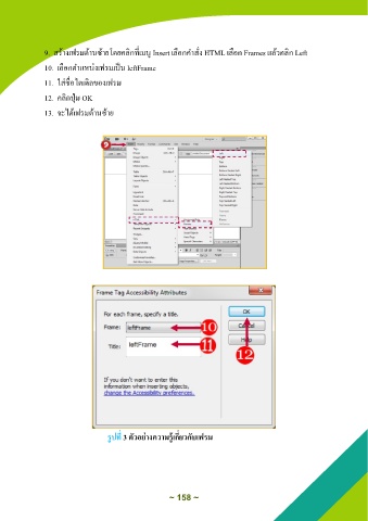 9. สร้างเฟรมด้านซ้ายโดยคลิกที่เมนู Insert เลือกค าสั่ง HTML เลือก Frames แล้วคลิก Left 10. เลือกต าแหน่งเฟรมเป็น leftFrame 11. ใส่ชื่อไตเติลาองเฟรม 12. คลิกปุ่ม OK 13. จะได้เฟรมด้านซ้าย รูปที่ 3 ตัวอย่างความรู้เกี่ยวกับเฟรม ~ 158 ~