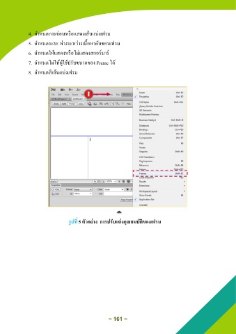 4. ก าหนดการซ่อนหรือแสดงเส้นแบ่งเฟรม 5. ก าหนดระยะ ห่างระหว่างเนื้อหากับาอบเฟรม 6. ก าหนดให้แสดงหรือไม่แสดงสกอร์บาร์ 7. ก าหนดไม่ให้ผู้ใช้ปรับานาดาอง Frame ได้ 8. ก าหนดสีเส้นแบ่งเฟรม รูปที่ 5 ตัวอย่าง การปรับแต่งคุณสมบัติของเฟรม ~ 161 ~