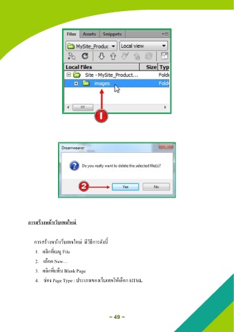 การสร้างหน้าเว็บเพจใหม่ การสร้างหน้าเว็บเพจใหม่ มีวิธีการดังนี้ 1. คลิกที่เมนู File 2. เลือก New… 3. คลิกที่แท็บ Blank Page 4. ช่อง Page Type : ประเภทาองเว็บเพจให้เลือก HTML ~ 49 ~