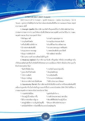 SWOT ย่อมาจากคําว่า Strength = จุดแข็ง Weakness = จุดอ่อน Opportunity = โอกาส