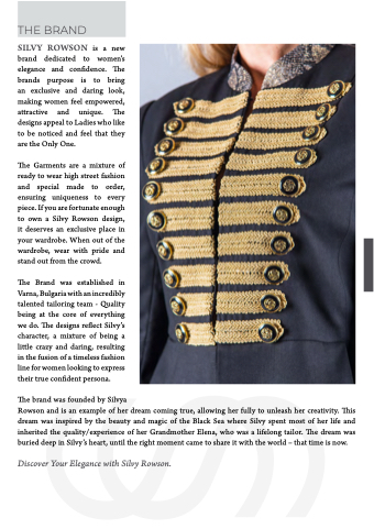 The Brand was established in Varna, Bulgaria with an incredibly talented tailoring team - Quality being at the core of everything we do. The designs reflect Silvy’s character, a mixture of being a little crazy and daring, resulting in the fusion of a timeless fashion line for women looking to express their true confident persona.