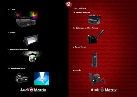 7. FX / EFECTOS h. Laser a. Càmara de niebla b. Cañon de papelillo / Ventury i. strover c. Lanza-llamas j. Mirror Ball/ Bola espejo k. Maquina de humo d. creo-jet