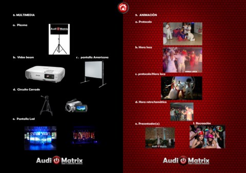 8. MULTIMEDIA 9. ANIMACIÓN a. Protocolo a. Plasma b. Hora loca b. Video beam c . pantalla Americana c. protocolo/Hora loca d. Circuito Cerrado d. Hora retro/temàtica e. Pantalla Led e. Presentador(a) f. Recreaciòn
