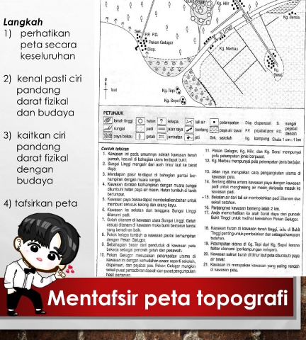 Langkah 1) perhatikan peta secara keseluruhan 2) kenal pasti ciri pandang darat fizikal dan budaya 3) kaitkan ciri pandang darat fizikal dengan budaya 4) tafsirkan peta Mentafsir peta topografi