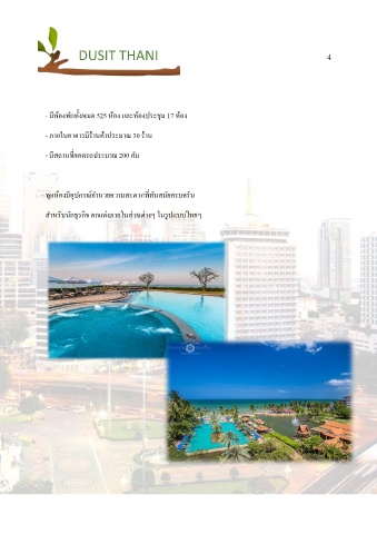 DUSIT THANI 4 - มีห้องพักทั้งหมด 525 ห้อง และห้องประชุม 17 ห้อง - ภายในอาคารมีร้านค้าประมาณ 30 ร้าน - มีสถานที่จอดรถประมาณ 200 คัน ทุกห้องมีอุปกรณ์อ านวยความสะดวกที่ทันสมัยครบครัน ส าหรับนักธุรกิจ ตกแต่งภายในส่วนต่างๆ ในรูปแบบไทยๆ