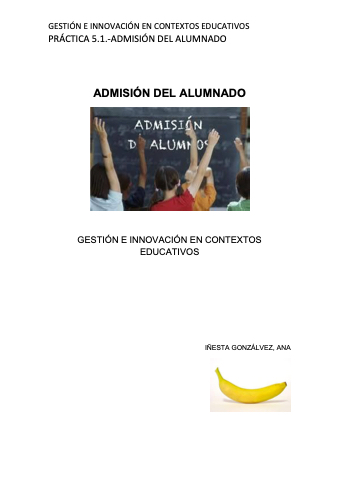 GESTIÓN E INNOVACIÓN EN CONTEXTOS EDUCATIVOS PRÁCTICA 5.1.-ADMISIÓN DEL ALUMNADO ADMISIÓN DEL ALUMNADO GESTIÓN E INNOVACIÓN EN CONTEXTOS EDUCATIVOS IÑESTA GONZÁLVEZ, ANA