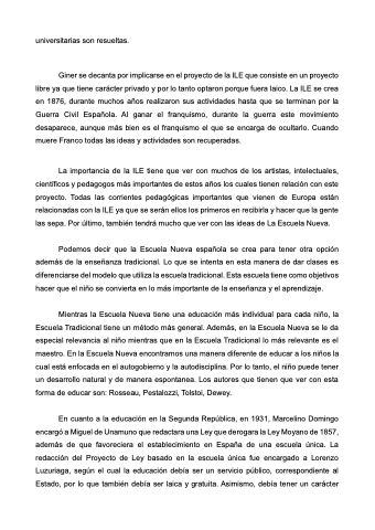 Giner se decanta por implicarse en el proyecto de la ILE que consiste en un proyecto libre ya que tiene carácter privado y por lo tanto optaron porque fuera laico. La ILE se crea en 1876, durante muchos años realizaron sus actividades hasta que se terminan por la Guerra Civil Española. Al ganar el franquismo, durante la guerra este movimiento desaparece, aunque más bien es el franquismo el que se encarga de ocultarlo. Cuando muere Franco todas las ideas y actividades son recuperadas.