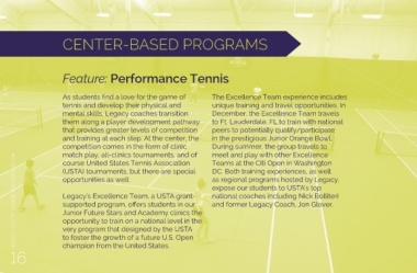 LEGACY YOUTH TENNIS AND EDUCATION LEGACY YOUTH TENNIS AND EDUCATION opportunities as well. as regional programs hosted by Legacy, Excellence Team program ideals BIENNIAL REPORT: 2014/15 & 2015/16