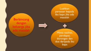 Luahkan perasaan kepada ibu bapa jika ada masalah Berbincang dengan keluarga jika ada masalah Minta nasihat, pendapat, dorongan dan doa daripada ibu bapa