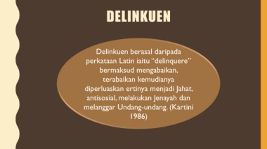 DELINKUEN Delinkuen berasal daripada perkataan Latin iaitu “delinquere” bermaksud mengabaikan, terabaikan kemudianya diperluaskan ertinya menjadi Jahat, antisosial, melakukan Jenayah dan melanggar Undang-undang. (Kartini 1986)