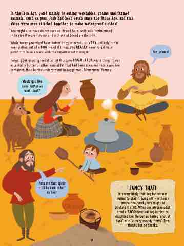 In the Iron Age, you’d mainly be eating vegetables, grains and farmed animals, such as pigs. Fish had been eaten since the Stone Age, and fish skins were even stitched together to make waterproof clothes!