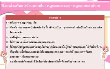 o ให้การสนับสนุนและการสนับสนุนในเชิงบวกเช่น ค าชม เมื่อผู้รับบริการดูแลตนเองได้เพิ่มขึ้น ชื่นชม