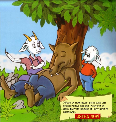 Убрзо су пронашли вука како сит спава испод дрвета. Извукли су децу вуку из желуца и напунили га камењем.