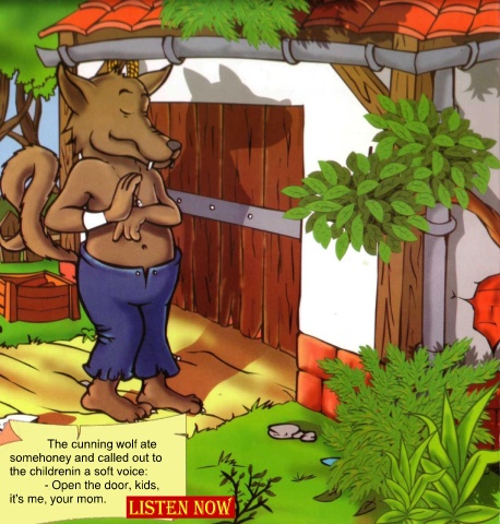 The cunning wolf ate somehoney and called out to the childrenin a soft voice: - Open the door, kids, it's me, your mom.