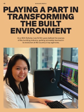 46 SCHOLAR’S PROFILE PLAYING A PART IN TRANSFORMING THE BUILT ENVIRONMENT As a BCA Scholar, Lee Si Min goes behind the scenes of the building industry, getting intimately involved in its evolution at the country’s top agencies.
